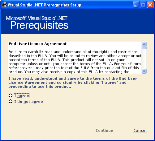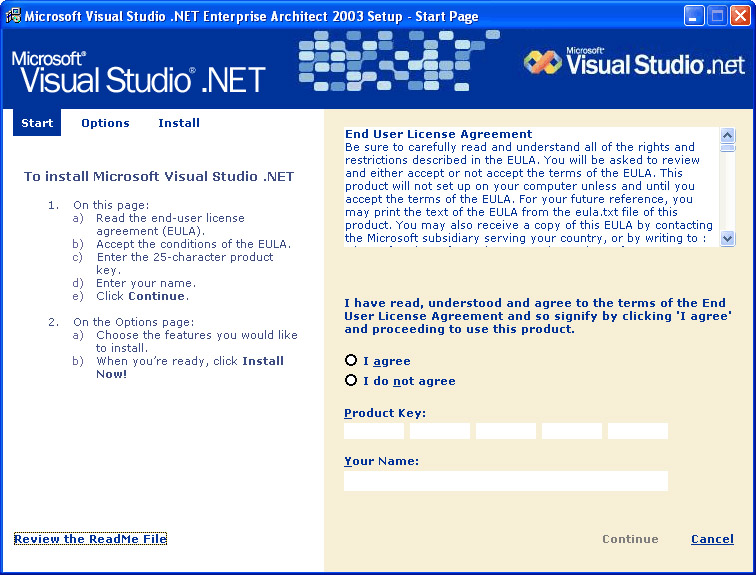Review the EULA, click I Agree, enter the product key and your name, and then click Continue to continue installing. (If you are not familiar with installing software such as Visual Studio .NET, you should click Review The ReadMe File prior to continuing the installation.)