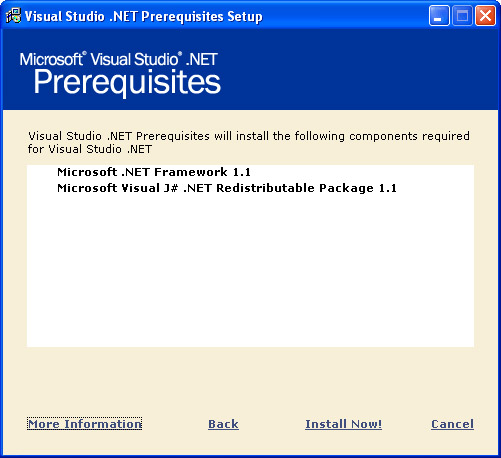 One of the components installed by the Visual Studio .NET Prerequisites is the .NET Framework 1.1. If you already have the .NET Framework 1.0 installed, the 1.1 version will be installed side-by-side with it, allowing applications to execute against either version of the framework (depending on how they’re configured). |