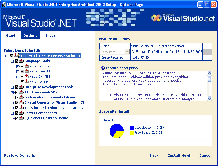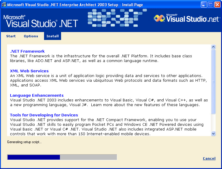 The steps and screen shots in the next section are based on the Enterprise Architect edition of Visual Studio .NET. The steps and screens for other editions will be similar, though there will be fewer options available in Step 4 when installing other editions of Visual Studio .NET. |