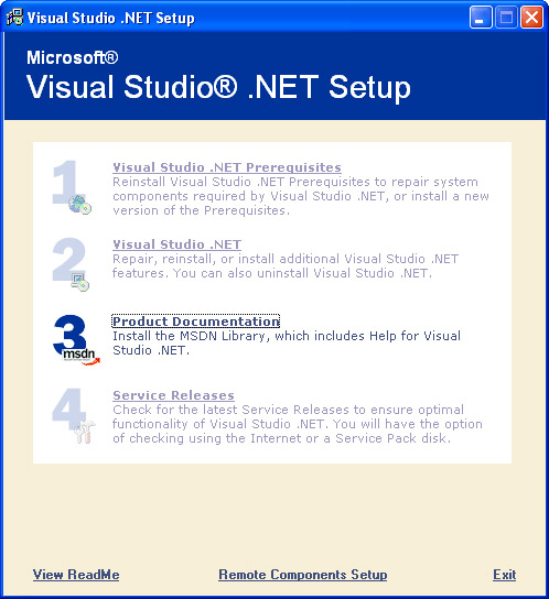Click View ReadMe in the Visual Studio .NET Setup dialog box if you want to read about installation and uninstallation, known issues, and other release notes. When you are finished, click Exit to exit Visual Studio .NET 2003 setup.