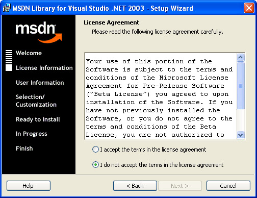 The license agreement for the MSDN Library will be displayed, as shown in the illustration on the next page.