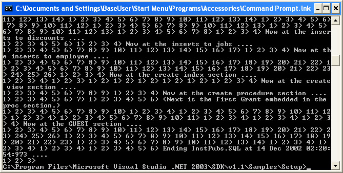 Open a command prompt, and navigate to the location of the instpubs.sql SQL script. By default, this will be C:\Program Files\Microsoft Visual Studio .NET 2003\SDK\v1.1\Samples\Setup. You might need to alter that path if you installed Visual Studio to a different location.