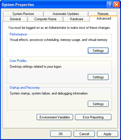 In the System Properties dialog box, click the Advanced tab. The dialog box will look similar to the illustration on the following page.