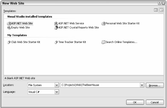 If you've developed with any previous version of ASP.NET or VS2005, I'm sure you will welcome this new option. I say this is an option because you can still create the project by using a URL as project path — creating and running the site under IIS — by selecting HTTP in the Location drop-down list. I suggest you create and develop the site by using the File System location, with the integrated web server, and then switch to the full-featured IIS web server for the test phase. VS2005 includes a new deployment wizard that makes it easier to deploy a complete solution to a local or remote IIS web server. For now, however, just create a new ASP.NET web site in a folder you want, and call it TheBeerHouse.
