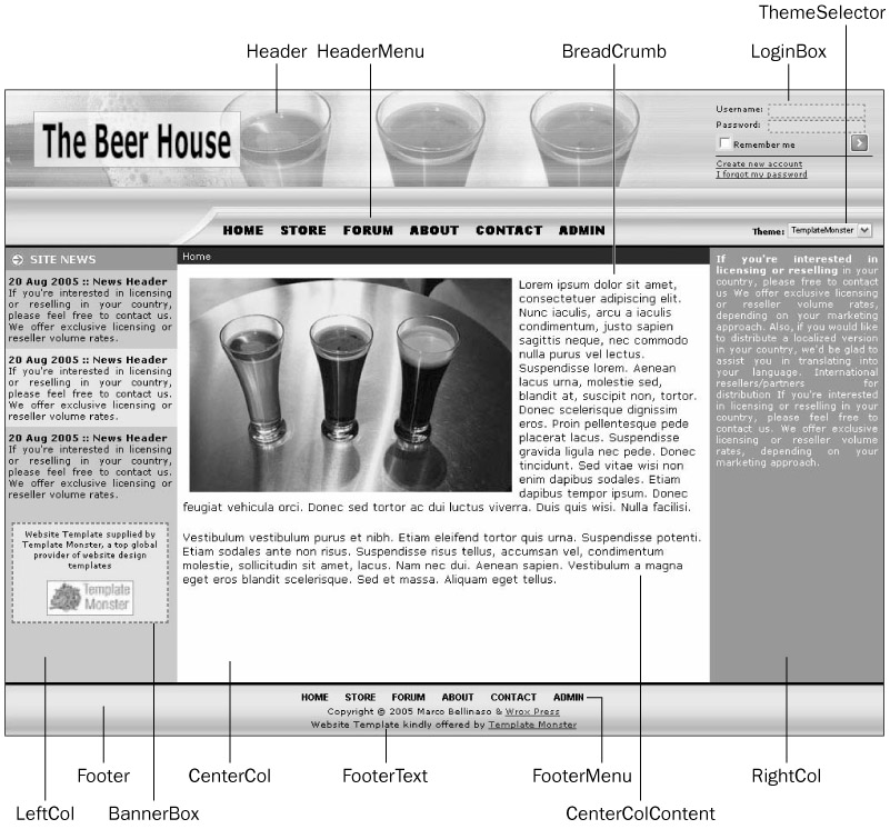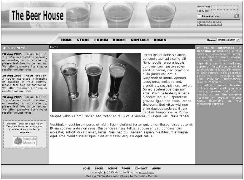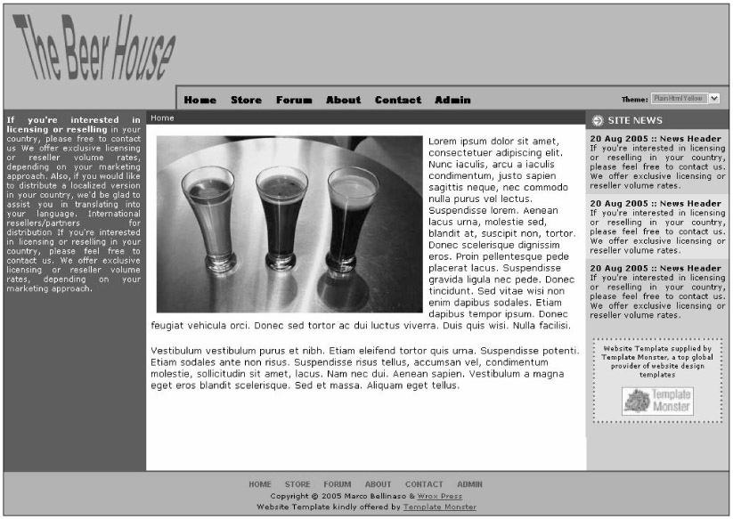 You're done! If you now run the project, by default you'll see the home page shown in Figure 2-4 (except for the login box, which doesn't contain anything so far — it will be filled in Chapter 5), with the TemplateMonster theme applied to it. If you pick the PlainHtmlYellow item from the ThemeSelector drop-down list, the home page should change to something very similar to what is shown in Figure 2-6.