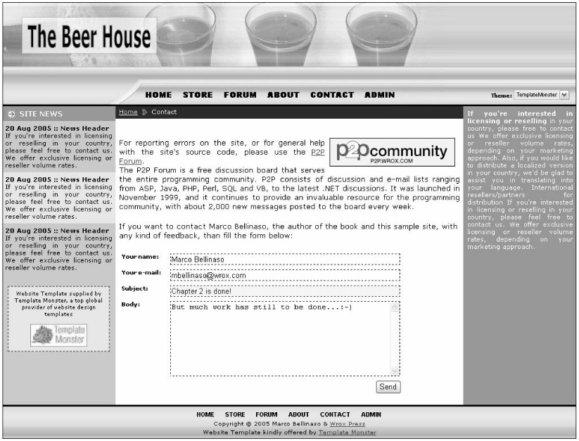 A single page (Default.aspx) is not enough to test everything we've discussed and implemented in this chapter. For example, we haven't really seen the SiteMapPath control in practice, because it doesn't show any link until we move away from the home page, of course. You can easily implement the Contact.aspx and About.aspx pages if you want to test it. I'll take the Contact.aspx page as an example for this chapter because I want to add an additional little bit of style to the TemplateMonster theme to further differentiate it from PlainHtmlYellow. The final page is represented in Figure 2-7.