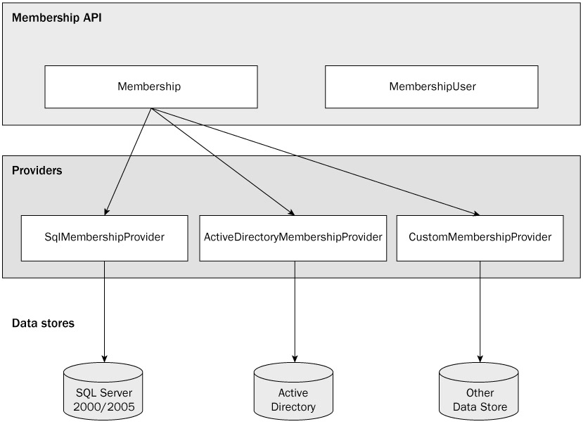 I use the term "data store" to refer to any physical means of persisting (saving) data — this usually means saving data in a database or in Active Directory, but .NET abstracts the actual data storage mechanism from the classes that manipulate the data. The provider class is the one that stores the data on behalf of other classes that manipulate data. This provider model design pattern, introduced in Chapter 3, is pervasive in .NET 2.0 — you can frequently "plug in" a different back-end provider to change the mechanism used to save and retrieve data. The Membership class uses a secondary class (called a membership provider) that actually knows the details of a particular data store and implements all the supporting logic to read and write data to/from it. You can almost think of the Membership class as a business layer class (in that it only manipulates data), and the provider class as the data access class which provides the details of persistence (even though a pure architect might argue the semantics). Two built-in providers are available for the Membership system, and you can choose one by writing some settings in the web.config file. The built-in providers are the ones for SQL Server 2000/2005 (SqlMembershipProvider) and for Active Directory (ActiveDirectoryMembershipProvider), but you can also write your own or find one from a third party (for use with Oracle, MySQL, DB2, etc., or perhaps XML files). Figure 4-1 provides a visual representation of the provider model design pattern.