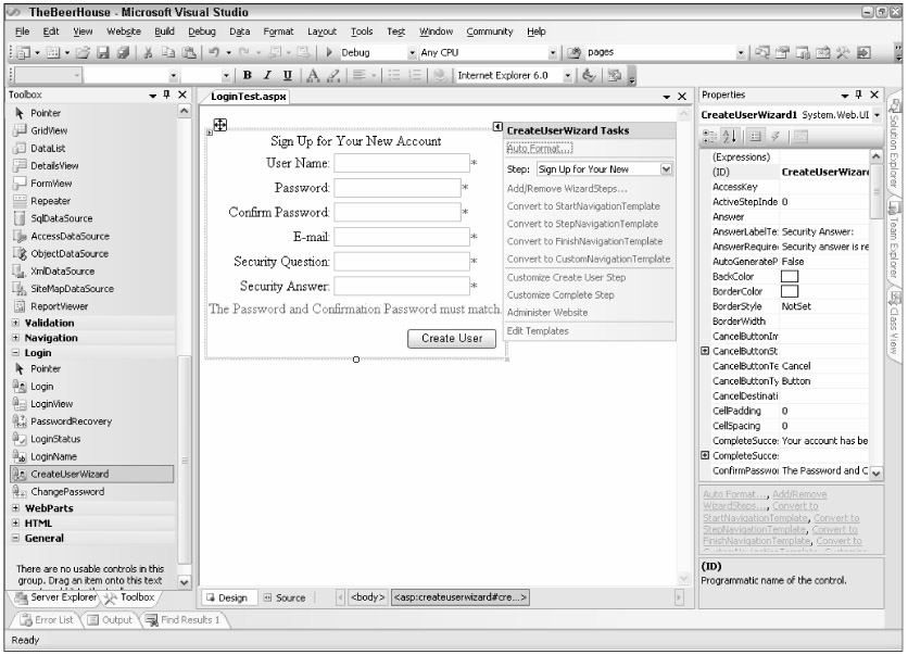 As you saw earlier, creating, validating, and managing users programmatically requires only a few lines of code. But what about writing no code at all? That's actually possible now, thanks to the new Login family of controls introduced with ASP.NET 2.0. These controls provide a pre-made user interface for the most common operations dealing with membership and security, such as creating a new account, logging in and out, retrieving or resetting a forgotten password, or showing different output according to the authenticated status of the current user. In Figure 4-5 you see a screenshot of the Visual Studio 2005 IDE, which shows the section of the Toolbox with the Login controls. It also shows a CreateUserWizard control dropped on a form, and its Smart Tasks pop-up window.