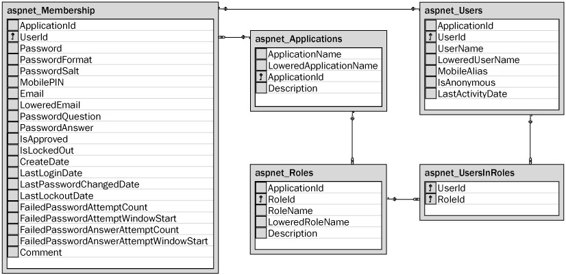 The SQL Server provider retrieves and stores the data from/to tables aspnet_Roles and aspnet_UsersInRoles. The latter links a user of the aspnet_Users table (or another user table, if you're using a custom membership provider for a custom database) to a role of the aspnet_Roles table. Figure 4-10 shows the database diagram again, updated with the addition of these two tables.