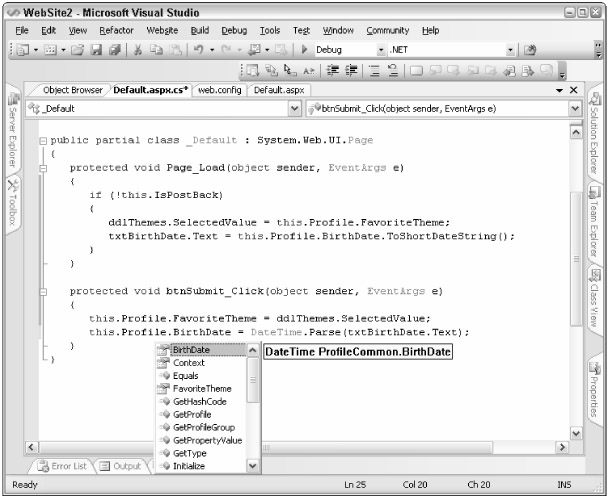 Even though you can't see these properties in the Object Browser, Visual Studio .NET is smart enough to compile this class in the background when the web.config file is modified, so you get full IntelliSense in the IDE, just as if the Profile properties were built-in properties of the Page class, like all the others. Figure 4-11 is a screenshot of the IDE with the IntelliSense in action.