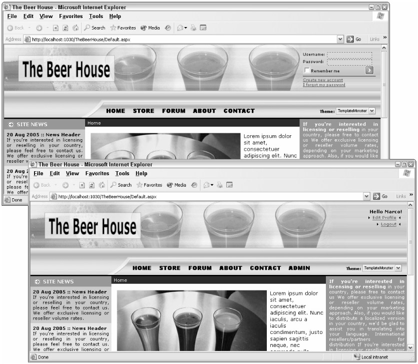 Absolutely no code is needed in the master page's code-behind files. In fact, because we used the right IDs for the textboxes and other controls in the template sections of the Login control, it will continue working autonomously as if it were using the default UI. To test the control, first create a new user through the ASP.NET Web Site Configuration Tool described earlier, and then try to log in. In Figure 4-14 you can see what the home page looks like from an anonymous user's and an authenticated user's point of view.