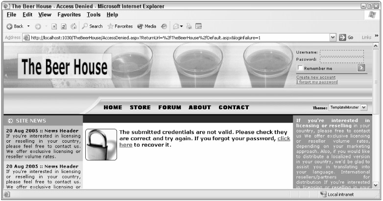 If you look a few pages back, you'll see that the loginUrl attribute of the web.config's <forms> is set to AccessDenied.aspx. As its name clearly suggests, this is the URL of the page we want to redirect control to when the user tries to access a protected page to which he doesn't have permission. In many cases you would place the login box in this page, hence the attribute name (loginUrl). In our case, however, we have a site that lets anonymous users access many different pages, and we only require the user to log in to gain access to a small number of pages, so we want to make sure the login box is visible from any page when the user is anonymous. The login box invites the user to log in if they already have an account, or to register if they don't have one. This AccessDenied page is also loaded when a user tries to log in but gives invalid credentials, or when they are already logged in but they don't have a role required by the page they requested. Therefore, the page has three possible messages, and the following code uses three labels for them: