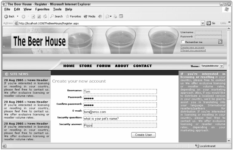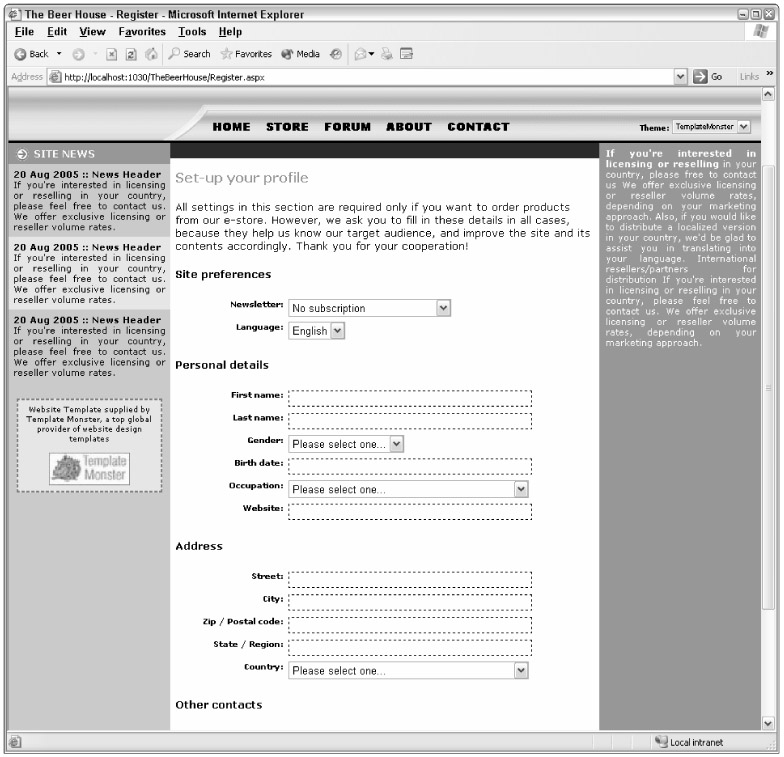 Users can create an account for themselves through the Register.aspx page that is linked just below the login box. This page uses the CreateUserWizard control described earlier. The first step is to create the account; the user interface for this is implemented by our custom template. The second step allows the user to fill in some profile settings, and uses the UserProfile control just developed above. The registration code that follows is pretty long, but it should be easy to follow without further comments:
