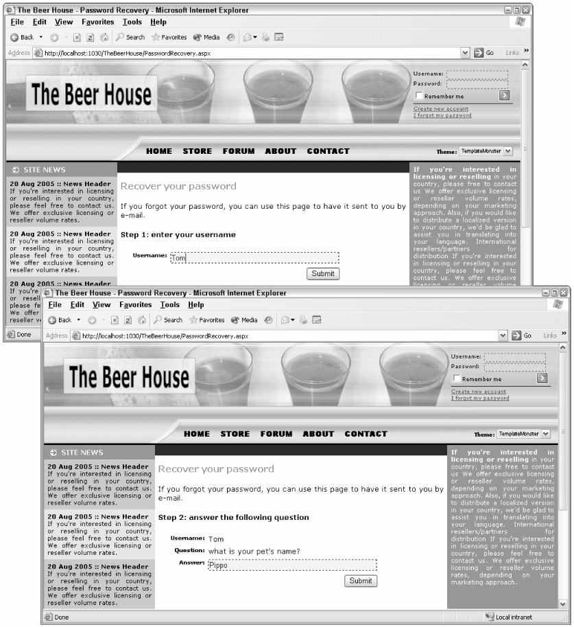 Under the login box is a link to PasswordRecover.aspx, which allows a user to recover a forgotten password, by sending an e-mail with the credentials. The page uses a PasswordRecovery control with a custom template for the two steps (entering the username and answering the secret question). The code follows: