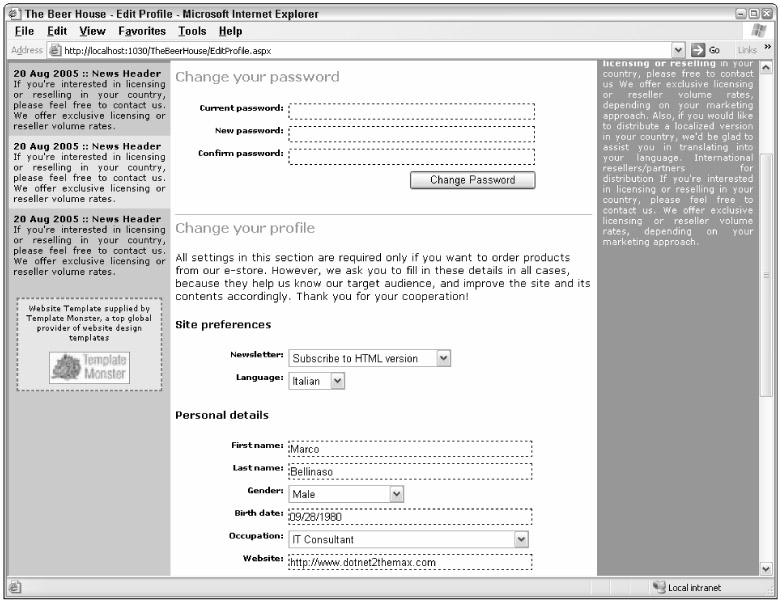 Once users log in, they can go to the EditProfile.aspx page, linked in the top-right corner of any page, and change their password or other profile settings. The password-changing functionality is implemented by way of a custom ChangePassword control, and the profile settings functionality is handled by the UserProfile control we already developed. Following is the code for the EditProfile.aspx file (with some layout code removed for clarity and brevity):