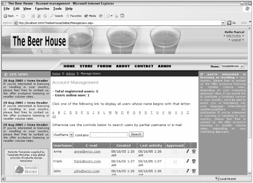 The third part of the page that lists users and some of their properties contains a GridView, which is a powerful new grid added to ASP.NET 2.0 that has been already introduced in Chapter 3. GridView can automatically take care of sorting, paging, and editing, without requiring us to write a lot of code. In this particular instance, however, I am only using the basic functionality; we'll use other advanced features of the GridView in subsequent chapters. You need to define the number and types of columns for the grid within the control's <Columns> section. Following is a list of columns for the grid: