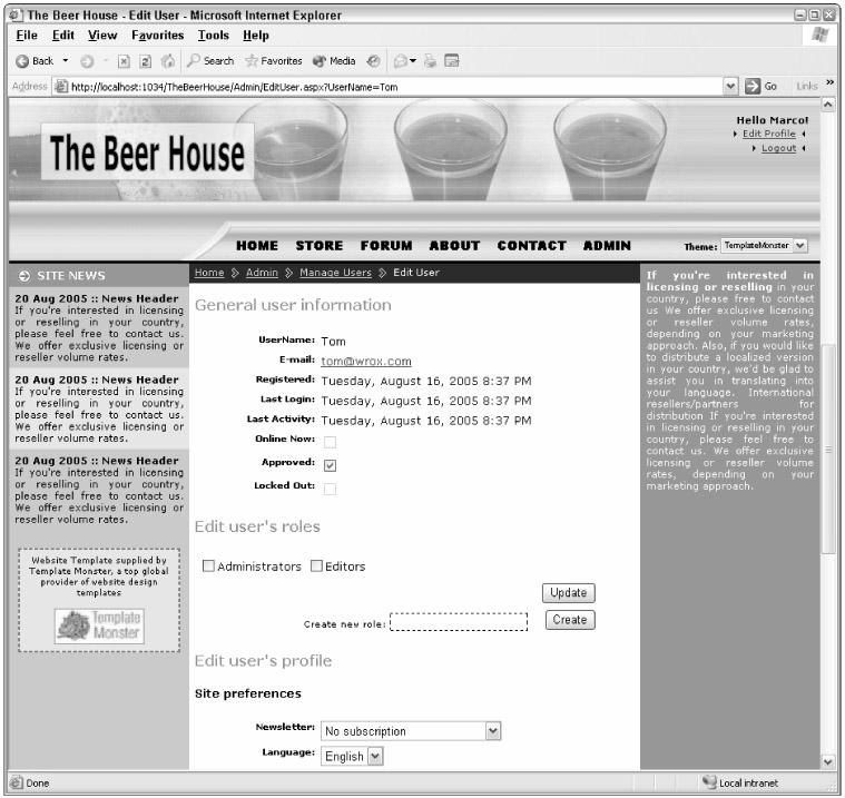 The EditUser.aspx page is linked from a row of the ManagedUsers.aspx grid. It takes a username parameter on the querystring, and allows an administrator to see all the membership details about that user (i.e., the properties of the MembershipUser object representing that user), and supports editing the user's personal profile. The user interface of the page is simple and is divided in three sections: