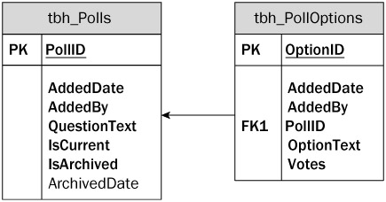We will need two tables for this module: one to contain the poll questions and their attributes (such as whether a poll is current or archived) and another one to contain the polls' response options and the number of votes each received. The diagram in Figure 6-1 shows how they are linked to each other.