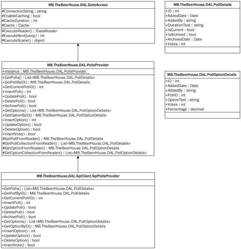The DAL of this module is based on a simple form of the provider model design pattern, introduced in Chapter 3 and then implemented for the articles module in Chapter 5. You'll follow the same strategy here, to create a PollsProvider abstract class that defines the signature of data access methods, and some helper methods that copy data from a DataReader into a single custom entity class or a collection of objects, and then a concrete provider class, SqlPollProvider, that implements the abstract methods. The methods implemented by the SQL Server-specific provider will only be simple wrappers around the stored procedures listed above — there is a one-to-one relationship. There are also two custom entity classes, PollDetails and PollOptionDetails, which have wrapper properties for all fields of the tbh_Polls and tbh_PollOptions database tables, plus the additional Votes and Percentage fields added by the stored procedures. The diagram shown in Figure 6-2 represents all these classes and lists their methods and properties, which should be self-explanatory.