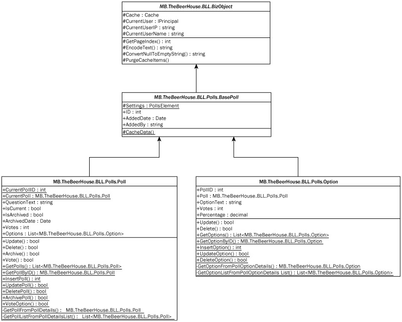 As you see, the structure is the same as the structure employed in Chapter 5. There's a BizObject base class with a number of properties and methods that are shared among all business classes. Then there's a module-specific BasePoll class that defines the ID, AddedBy, and AddedDate properties (that both the polls and the poll options have), a reference to the PollsElement configuration element described above, and a CacheData method that caches the input data if the settings indicate that caching is active. In addition to the data read from a PollDetails object, the Poll class also has CurrentPollID and CurrentPoll static properties: the former returns the integer ID of the poll marked as current, and the latter returns an instance of Poll that completely represents the current poll.