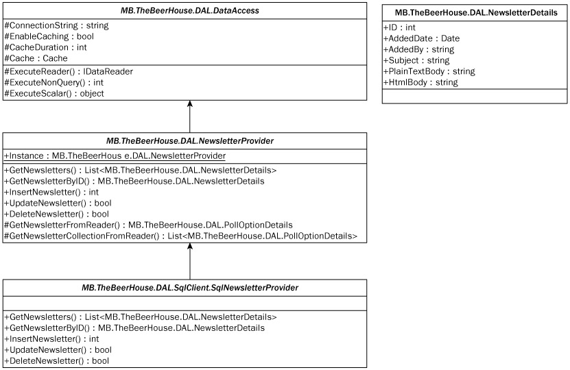 As usual, the DAL for this module is based on the provider model design pattern, and the SQL Server provider is included as an example, which is just a wrapper around the stored procedures described above. The DAL uses a NewsletterDetails custom entity class, which wraps the data of a single newsletter record. The diagram in Figure 7-2 describes the DAL classes and their relationships.