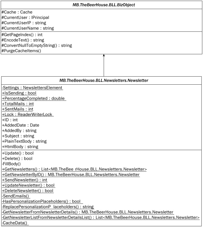This is where things become interesting, because in addition to wrapping the data operations of the DAL in an object-oriented class, the MB.TheBeerHouse.BLL.Newsletters.Newsletter class also contains all the logic for sending out a newsletter asynchronously from a separate background thread, and for updating the progress status information. Figure 7-3 represents the UML diagram of this class (together with the usual Bizobject base class) and lists its public and private properties and methods.