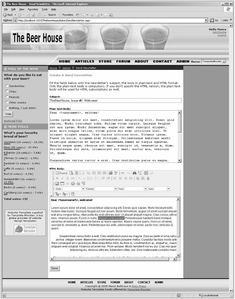 Note that the call to Newsletter.SendNewsletter is very simple — it's not obvious that the newsletter is sent asynchronously from looking at the preceding code. This is intentional: We're hiding the details of the complex code to free the UI developer from needing to know the underlying details. Figure 7-4 is a screenshot of the page with some plain-text and HTML content in the textboxes.