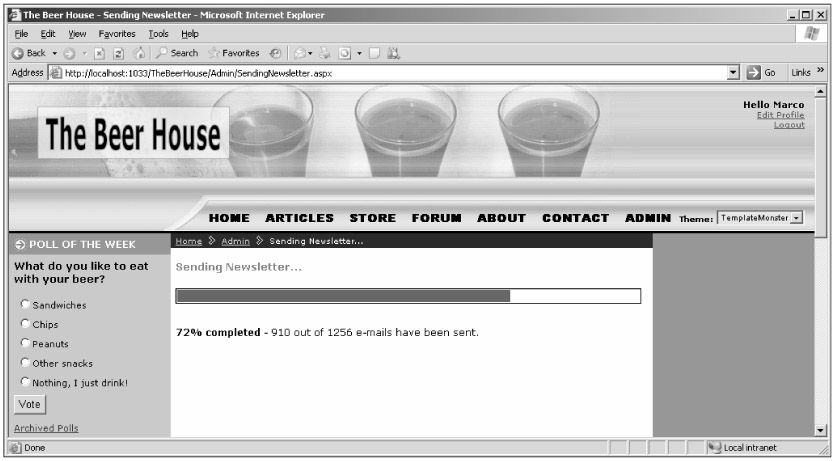 The markup of this page can be split up into two parts: The first includes the code for the progress bar and the status information (or a panel with a message if no newsletter is being sent), and the other has the JavaScript callback function called after ASP.NET performs the lightweight postback to the server, to retrieve information about the progress of the newsletter being sent. The progress bar is rendered as two nested DIVs: The outer DIV is as large as the page's content section, and the inner DIV's width will be set to the completed percentage retrieved from the server, and updated every couple of seconds. There's also another DIV that will contain the number of e-mails sent and the number of total subscribers, as textual information. Finally, there's another DIV that's initially hidden, containing an image representing an "OK hand"; this will be displayed when the completion percentage reaches 100%. All three DIVs are assigned a fixed ID, so that it will be easy to reference them from the JavaScript code by means of the window.document.getElementById DOM function. Here's the code for this first part: