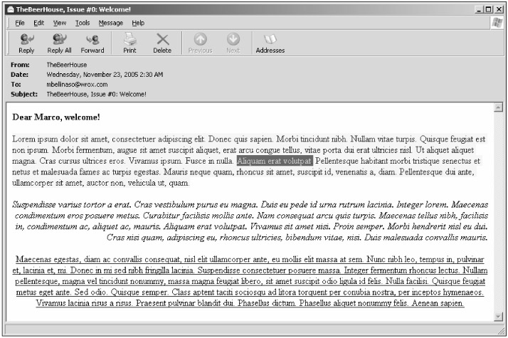 Figure 7-7 is a screenshot of the HTML newsletter represented in Figure 7-4 after it arrives in the subscriber's mailbox and is opened with Outlook Express.