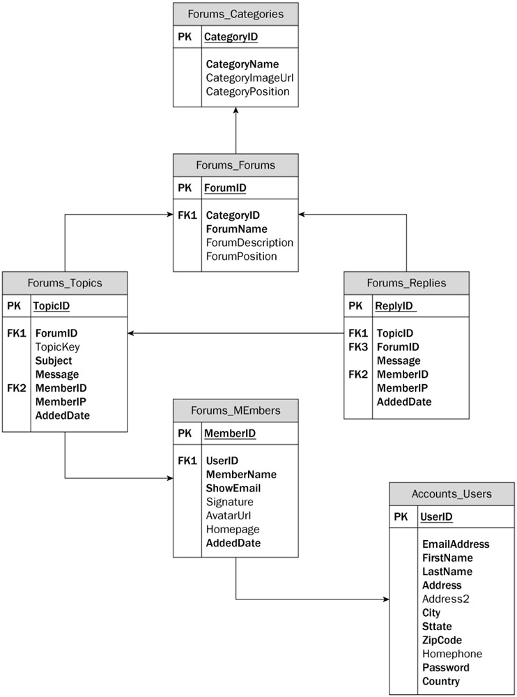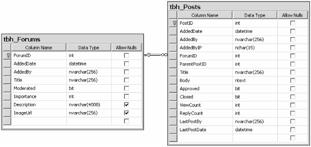 In the case of ParentPostID, the replies will always link to the first post of the thread, and not to another reply. Therefore, the proposed structure does not support threaded discussions, such as those in Internet newsgroups. Instead, posts of non-threaded discussions will be shown to the reader, sorted by creation date, from the oldest to the newest, so that they are read in chronological order. Both of these two types of forum systems, threaded or not, have their pros and cons. Threaded discussions make it easier to follow replies to previous posts, but non-threaded discussions make it easier to follow the discussion with the correct temporal order (time-sequenced). To make it easier for the reader to follow the discussion, non-threaded discussions usually allow users to quote a previous reply, even if the referenced reply is a number of posts prior to that one. In my research, non-threaded discussions are more widely used, and easier to develop, so we'll use them for our sample site. If you want to modify the forum system to support threaded discussions, you'll be able to do that without modifying the DB; you just need to set the post's ParentPostID to the appropriate value.