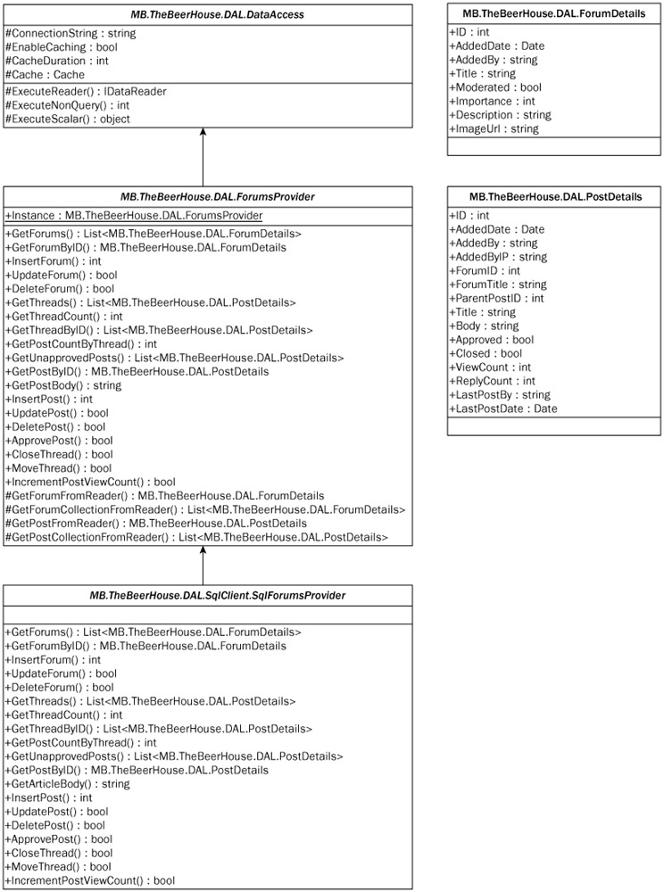 As usual, the DAL consists of a number of entity classes that wrap data from the database tables (the ForumDetails and PostDetails classes), an abstract class defining a number of virtual methods to manipulate the data and a few helper methods (ForumsProvider), and finally a concrete class that inherits from the abstract class and implements its virtual methods with the code to call the respective stored procedures. Figure 8-3 shows the UML diagram of all these classes and their relationships.