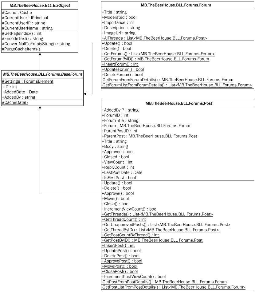 Like the DAL, the BLL for this module is very similar to the other BLLs used in this book. There's a BaseForum class that contains the usual ID, AddedDate, and AddedBy properties common to both the tbh_Forums and the tbh_Posts tables, a Settings property, which returns an instance of the ForumsElement class, which wraps all forums' settings read from web.config, and finally a CacheData method that caches the input data according to the forums' settings. The derived classes are Forum and Post. Forum is almost identical to the Category class designed and implemented in Chapter 5, with the addition of the Moderated property. Post represents both threads (the first post of a thread) and replies, and it has properties that wrap all data coming from the PostDetails DAL class, plus instance methods such as Update, Delete, Approve, MoveThread, and CloseThread that manipulate the data contained in the current object. These instance methods simply forward the call to static methods that in turn call the respective DAL methods and add some logic to store and purge data from the cache, add data validation, and so on. The methods for retrieving a single post, the list of posts for a given thread, or the list of threads for a given forum are also implemented as static methods. Figure 8-4 shows the UML diagram of the BLL.