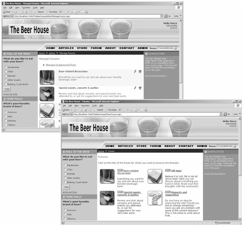 In the future, if you want to remove a given user's right to post new messages, you only need to remove the user from the Posters role, using the EditUser.aspx administration page developed in Chapter 4. This module's administration page also has some <location> section restrictions in the web.config file located under the Admin folder to ensure that only Administrators, Editors, and Moderators can access them.