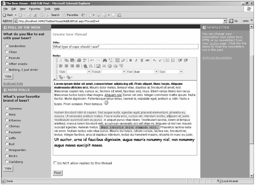 This page has a simple interface, with a textbox for the new post's title, a FCKeditor instance to create the post's body with a limited set of HTML formatting, and a checkbox to indicate that you won't allow replies to the post (the checkbox is only visible when a user creates a new thread and is not replying to an existing thread, or the user is editing an existing post). Figure 8-6 shows how it is presented to the user who wants to create a new thread.