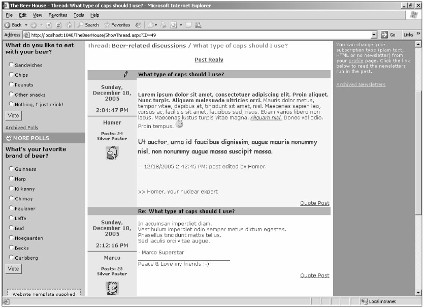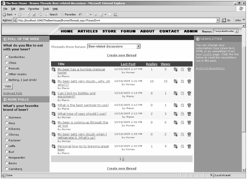 This page takes a ForumID parameter on the querystring with the ID of the forum the user wants to browse, and fills a paginable GridView control with the thread list returned by the Post.GetThreads business method. Figure 8-8 shows a screenshot of this page.