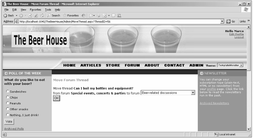 This page contains a DropDownList with the list of available forums and allows power users to move the thread (whose ID is passed on the querystring) to one of the forums, after selecting it and clicking the OK button. Figure 8-9 shows this simple user interface.