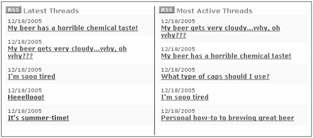 Once you have the page working, you can use the generic RssReader.ascx user control (developed in Chapter 5) to consume some feeds, and therefore publish the list of threads (sorted in different ways) on various parts of the site. I've added two feeds on the ShowForums.aspx page, to show the list of "n" newest threads, and the "n" threads with the most replies (where "n" is specified in the web.config file), but you can also easily add them to the site's home page or to any other page you wish. Here's the code to consume the two feeds: