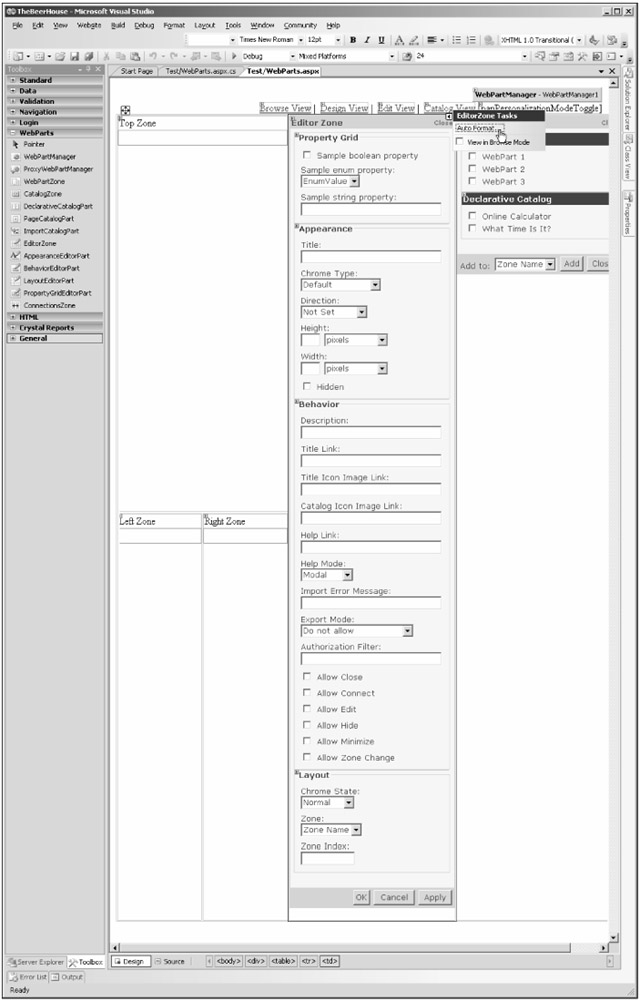 It only takes a few minutes to build a sample page to test the appearance and behavior of the Web Part examples we made earlier. You can do everything from the visual designer: Draw a table with a first row that has a single cell spanning two columns, and put a WebPartZone inside it. Split a second row into two cells and insert a WebPartZone inside each of them. Then, on the first row, create two more columns that span two rows: Insert an EditorZone inside the first one, and drop all available EditorParts inside its surface; then do the same with the CatalogZone and the catalog parts on the last column. At the top of the page add a WebPartManager control, and a few LinkButton controls to activate the various display modes on the page. Finally, spice up the appearance of the page a bit, by applying one of the pre-built styles to the controls, from the controls' Smart Tasks Auto Format dialog window. Figure 10-1 shows the final page as displayed by the graphical designer.