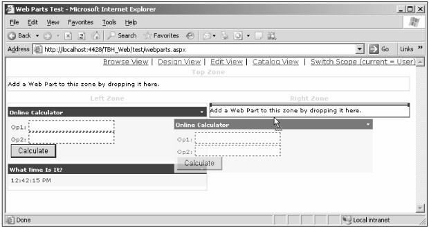 Figure 10-5 is the most spectacular because it shows the page in design mode as I was dragging a Web Part from one zone to another (don't confuse the Web Part design mode with Visual Studio's design mode — Web Parts have a runtime design mode to enable users to edit their configuration). The Web Part being dragged shows as a semi-transparent floating layer, which gives you clear feedback about what you're dragging and what space it is going to occupy after the drop.