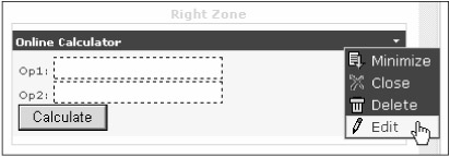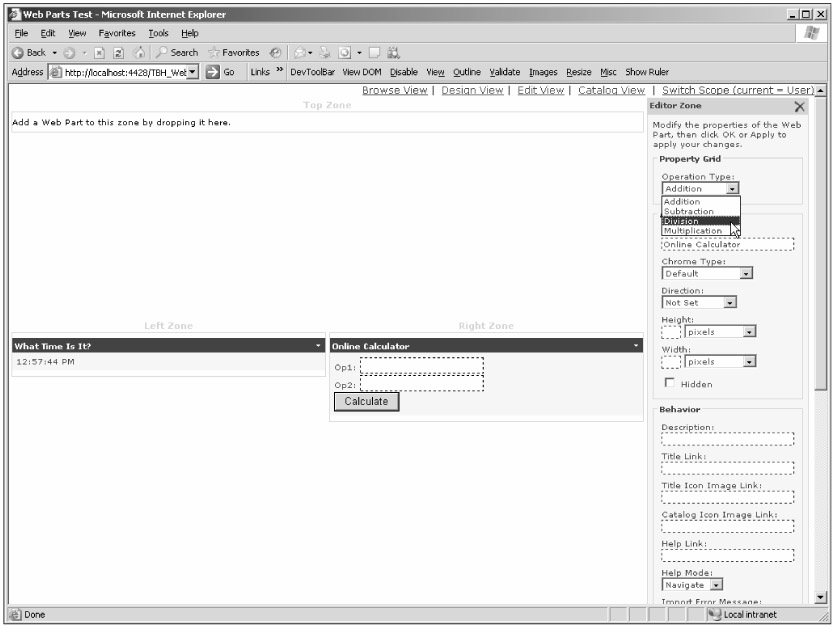 Figure 10-7 shows the page while editing the Online Calculator Web Part. Note how the Operation custom property is editable by means of a DropDownList control created by the PropertygridEditorPart control.