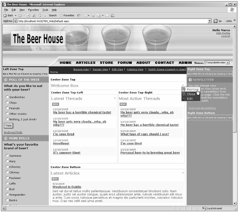 Figure 10-10 represents the home page while in design mode, with the Welcome Box in minimized state, and three instances of the RssReader control placed on three different Web Part zones in the site's central column.