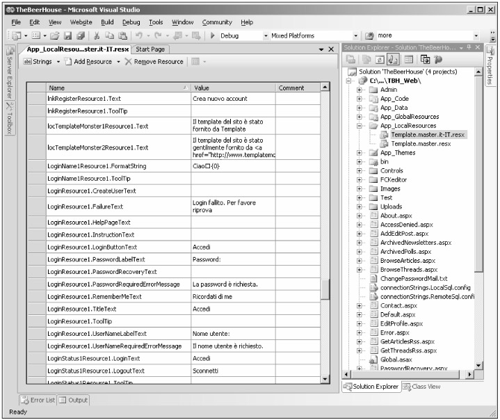 As a sample implementation for this chapter, I fully localized the command layout stored in the template.master file, and most of the user controls, especially those that are part of the site's common structure, such as NewsletterBox, PollBox, ShoppingCartBox, ThemeSelector, WelcomeBox, and PersonalizationManager. To do this, you start by editing the template.master file and wrapping the static text you want to localize (such as the copyright notices, or the acknowledgments to Template Monster for providing the sample layout) into Localize controls. Then, from the Design View, you execute the Generate Local Resource command for the master page, thus creating a Template.master.resx file under the root App_LocalResources special folder. You copy this file into the same folder, rename it to Template.master.it-IT.resx (for Italian), open it in Visual Studio's resource editor, and translate all string values to the destination language. Figure 11-10 is a screenshot of the resource file for Italian opened in the editor.