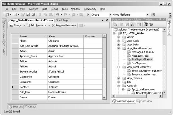 Yet another thing you want to localize is the Web.sitemap file. There isn't a command that localizes this automatically for you, however, so you must manually create global resource files for it, named SiteMap.resx and SiteMap.it-IT.resx, and located under the root App_GlobalResources folder. You create a key-value pair for each link defined in the site map, and translate them to the other language. At this point, the Solution Explorer and the resource file for the localized site map look like what is shown in Figure 11-12.