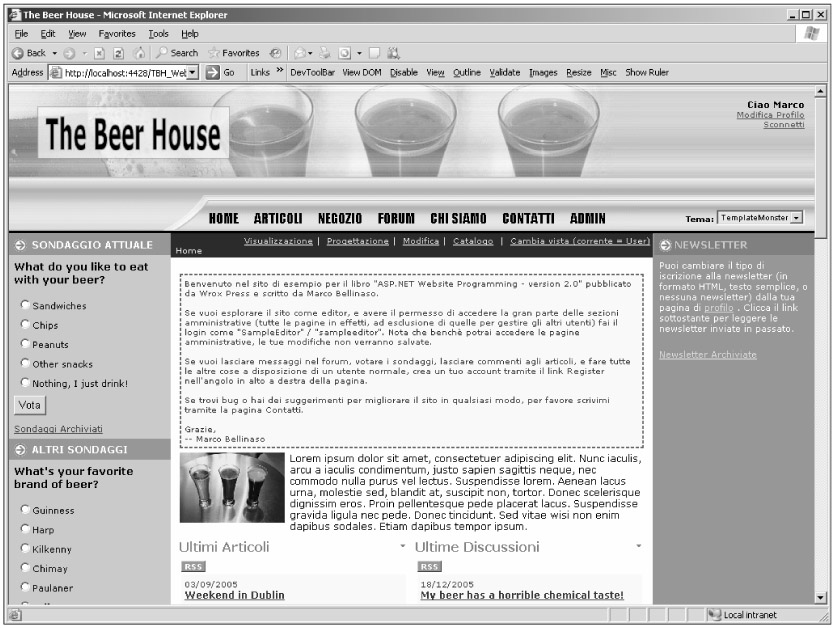 Recall that in Chapter 4, this profile property was made accessible for anonymous users also, with a default value of "en-US", so you don't need to verify that the current user is authenticated to safely read this property. You're now ready to test the localized home page: Run the site and log in with your test user, go to your profile page, switch the language to Italian (or to whatever language you've added support for) and return to the home page to see how it is translated. Figure 11-13 shows the home page fully translated to Italian, except for the dynamic data stored in the database, of course (such as poll questions and options, and forum thread and article titles).