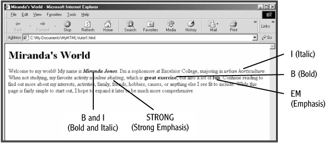 In the following example, apply italic and bold highlighting using both the I and B elements and the EM and STRONG elements (see Figure 2.4):