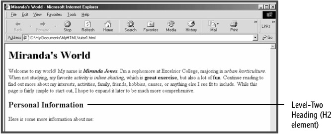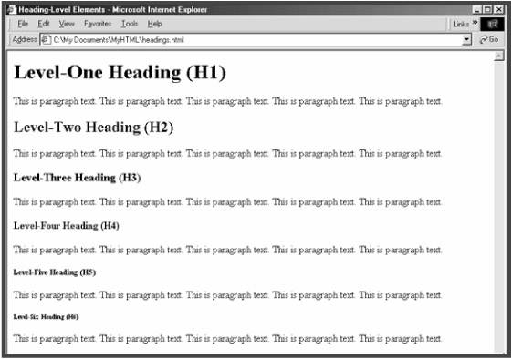 Besides the H1 and H2 heading elements, which you have already used to add level-one and level-two headings to the page (defining a top-level heading and a major section heading), there are four additional heading elements that can be used—H3, H4, H5, and H6. The H3 (Level-Three Heading) element is used to specify minor subheadings, and the H4 (Level-Four Heading) element can be used to create a further level of subheadings. The H5 and H6 elements are rarely used, since they display by default in font sizes that are smaller than the default text size (used to display paragraph and other body text). An example page, headings.html, is included in the resources folder in your MyHTML folder that you can open in your browser to see what all of the heading elements look like (see Figure 2.6).
