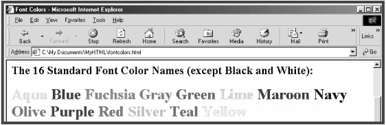 To see the colors set by the standard color names (other than black and white), just open fontcolors.html in your browser from the MyHTML folder (see Figure 4.19):