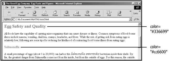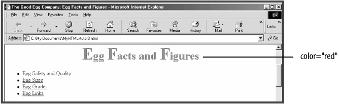 Since this book's figures are in black and white, you won't be able to see the color changes demonstrated in this section by looking at the figures alone. To see the colors, be sure to frequently save your page in your text editor, hop over to your browser, and refresh the display of your page. |