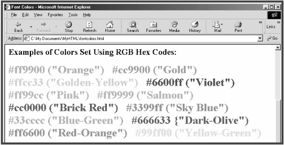 For instance, a red color here can be specified as #ff0000, a lime-green color as #00ff00, and a blue color as #0000ff. (ff is the highest hexadecimal number, equaling 255, whereas 00 is the lowest, equaling 0.) To see examples of colors set using RGB hex codes, just reopen fontcolors.html in your browser from the resources folder in your MyHTML folder (see Figure 4.21):
