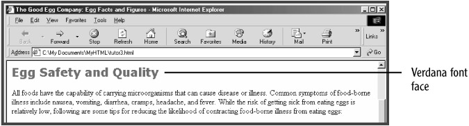 The FACE attribute can also specify a list of font faces, which is at least a partial way around this limitation. If the first font face is not available on a system, a second font face listed may be; if that font face is not available, a third font face might be. Add a FACE attribute for the initial H2 element, listing Verdana, Arial, and Helvetica as the font faces (see Figure 4.24):